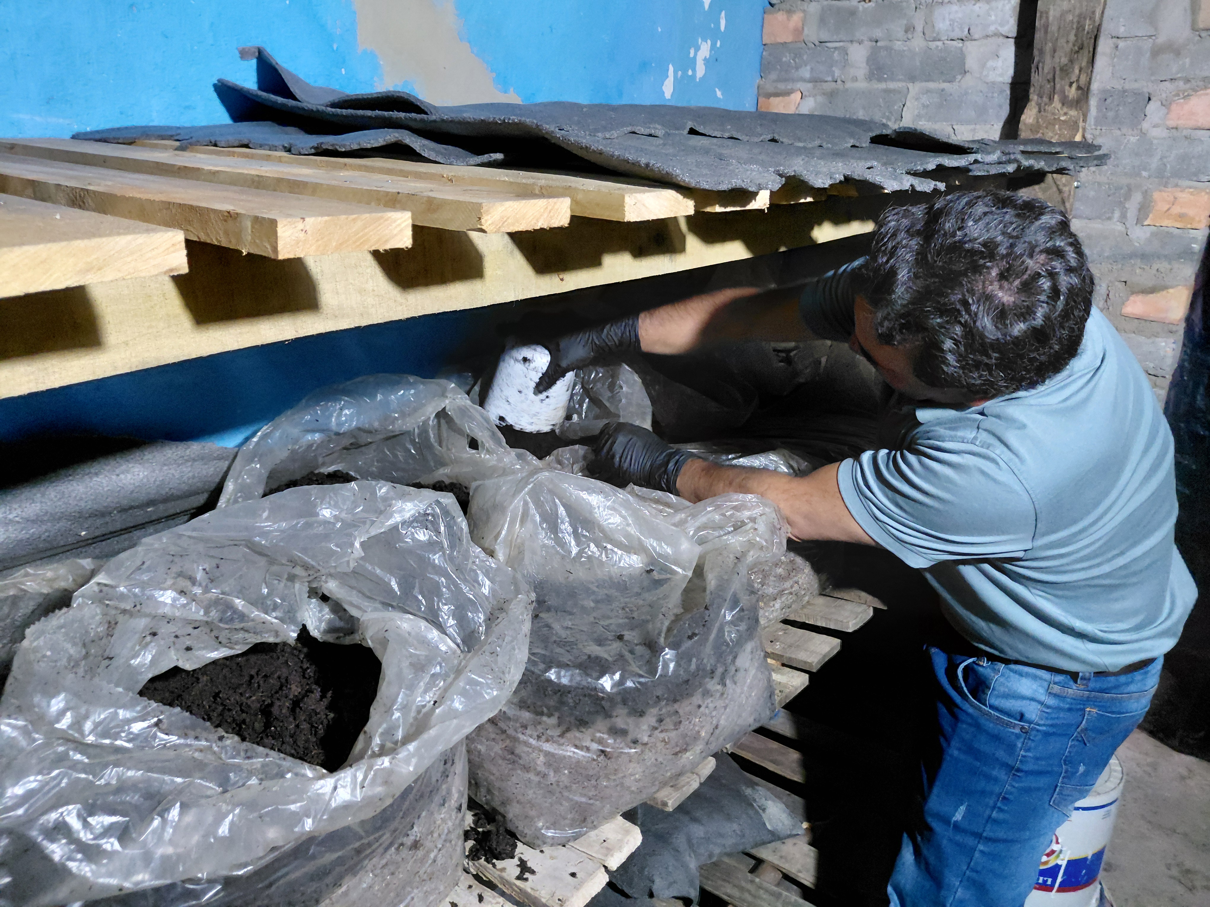 이제 균사가 고르게 퍼진 것을 확인하고 복토작업을 했다.