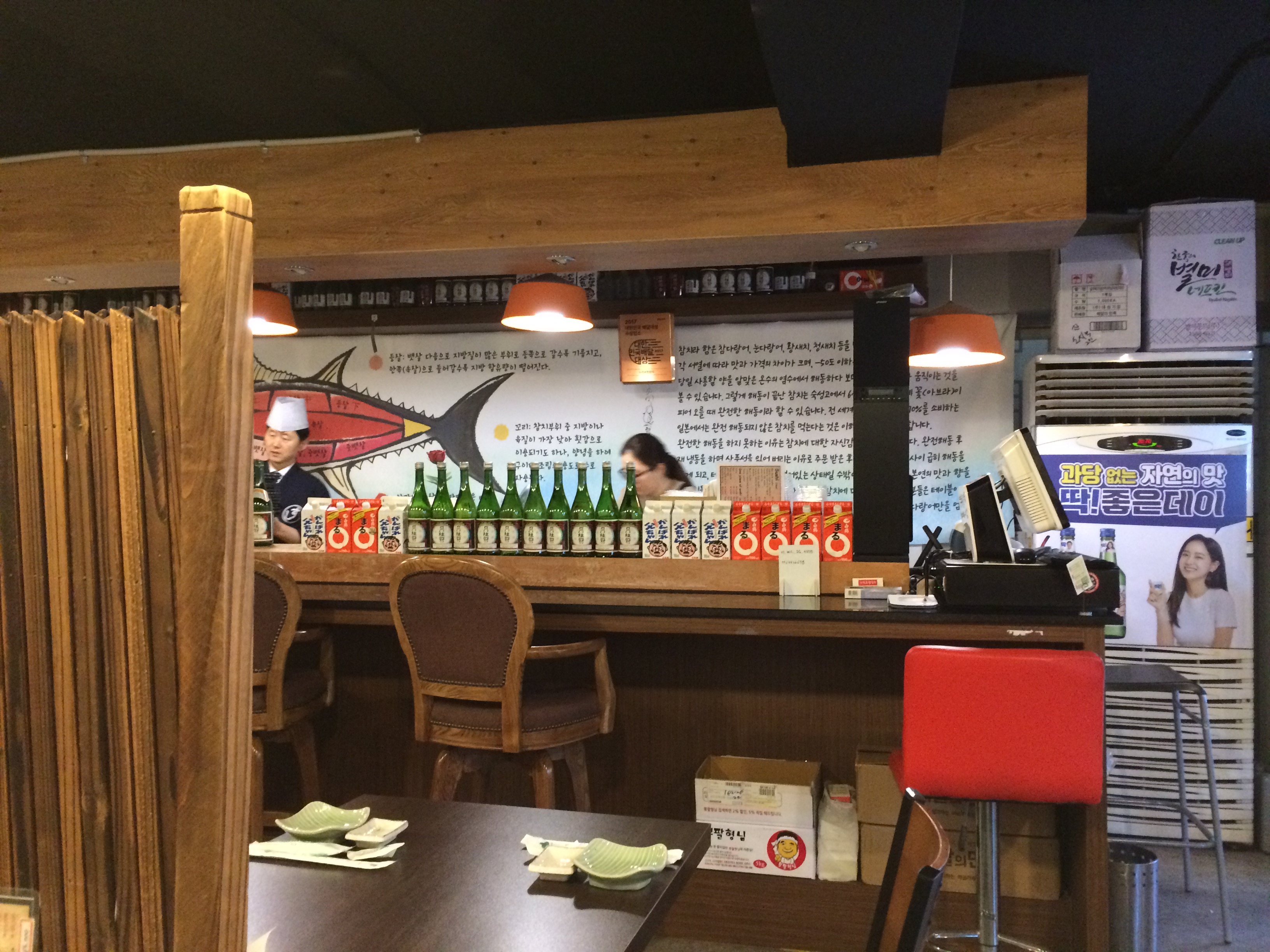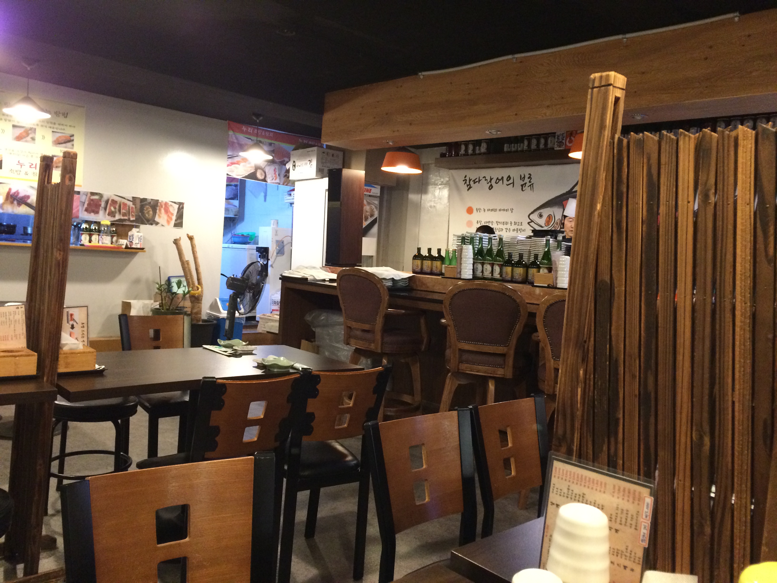 앞 뒤로 테이블이 8개에 주방에 닿은 자리가 6개가 있었다.