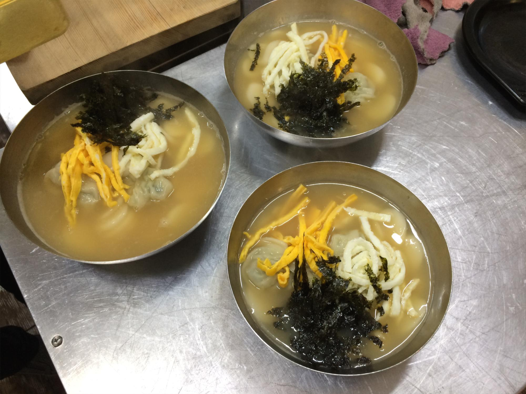 밑준비로 육수와 떡, 만두, 고명을 준비한다.